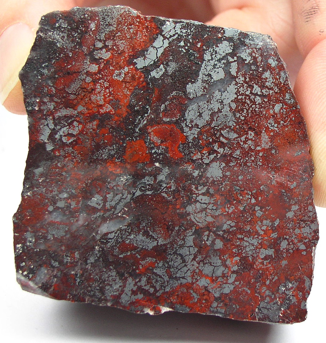 Ein Anschliff von blutroten Jaspis zusammen mit Hämatit. Das Stück stammt aus einer Pinge in der Nähe der Grube Büchenberg bei Elbingerode im Harz. Es handelt sich um ein Endstück – die Vorderseite ist geschliffen und poliert, die Rückseite ist naturbelassen. Solche Stücke mit dem intensiv roten Jaspis werden auch als „Harzer Blutstein“ bezeichnet.